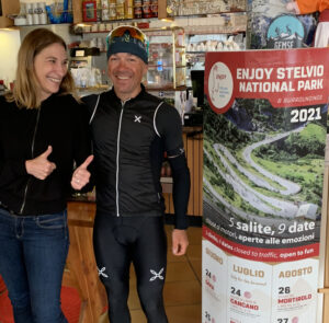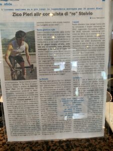 Jeder eingefleischte Velofahrer weiss, oder kann sich zumindest vorstellen, was es bedeutet das Stilfser Joch, den Stelvio 3 mal an einem Tag zu erklimmen… als wäre dies noch nicht genug! ZICO PIERI wiederholt das Ganze während 30 Tagen; je nach Wetter 3-4 Mal pro Tag! Auf meine Frage, wie er dies mit der Regeneration handhabe, antwortet er schlicht… “…non è così facile – ma possibile”.